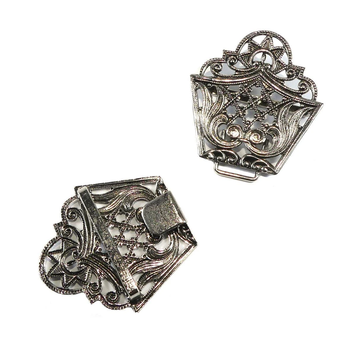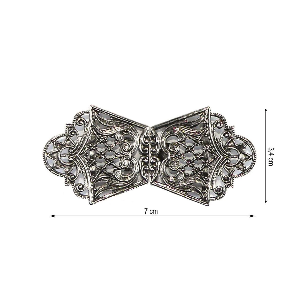 Broche metálico con forma de corona calada en color plata vieja o dorado viejo. El broche cerrado tiene una longitud total de 7cm y un ancho de 3,4cm. Con un paso de cinta de 2,5cm. Seleccionar el color deseado a continuación.