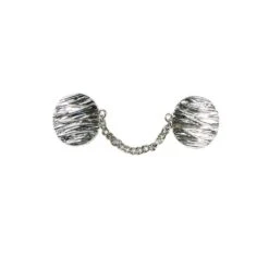 Broche metálico con original diseño de doble botón rayado con cadena y pinzas para sujetarlo. El broche cerrado tiene una longitud de 11cm. Tiene un ancho de 2,5cm.