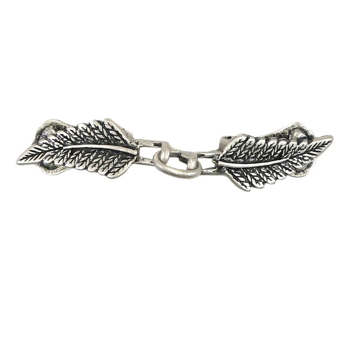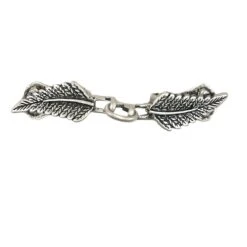 Broche metálico con pinzas como sujección sin necesidad de coser. Con precioso dibujo de plumas y una vez cerrado completa una longitud de 2,5cm. Tiene un ancho de 1cm.