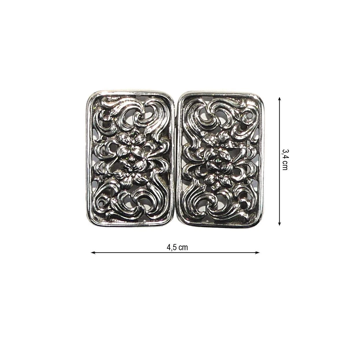 Broche metálico con forma rectangular en color plata vieja. El broche cerrado tiene una longitud total de 4,5cm y un ancho de 3,4cm. Con un paso de cinta de 3cm.