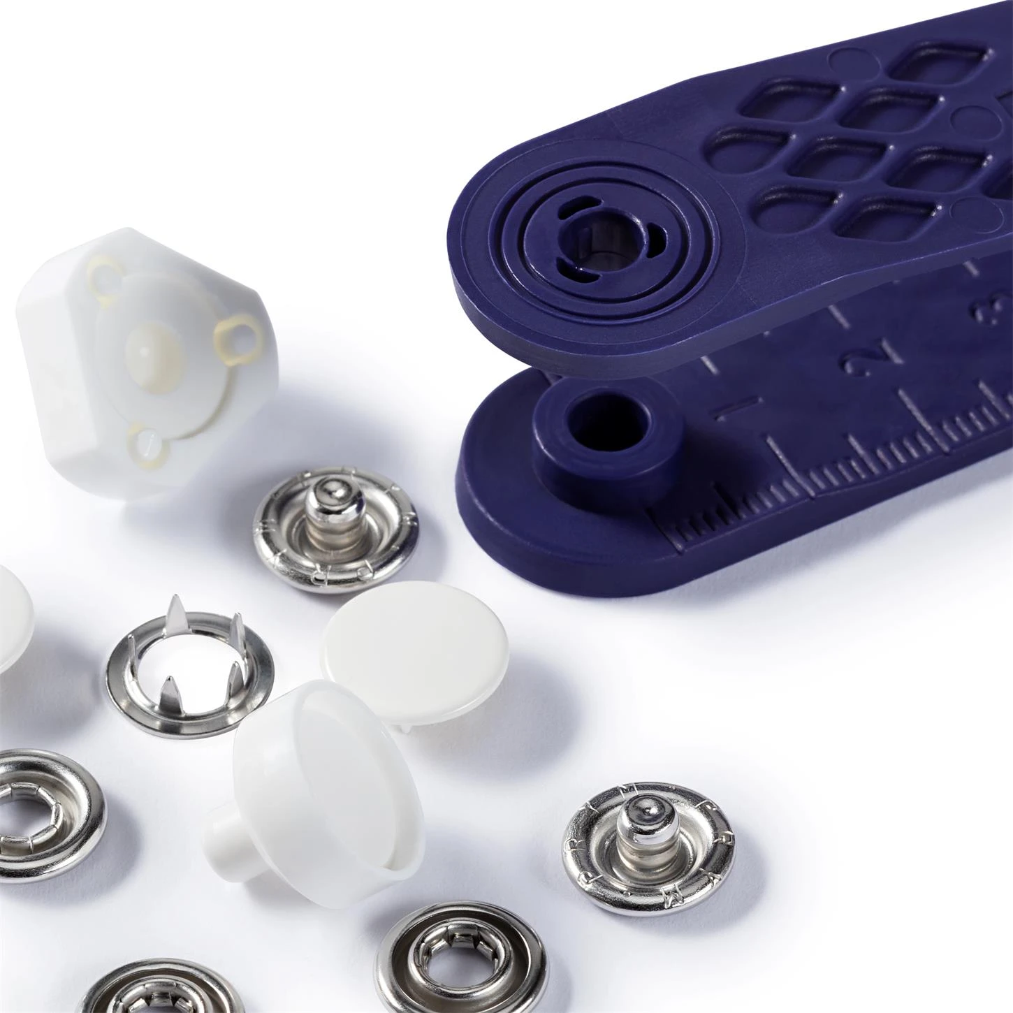 Paquete de 6 conjuntos para realizar broches de presión clásicos en color blanco junto a un ensamblador. El diámetro interior del broche es de 12mm.