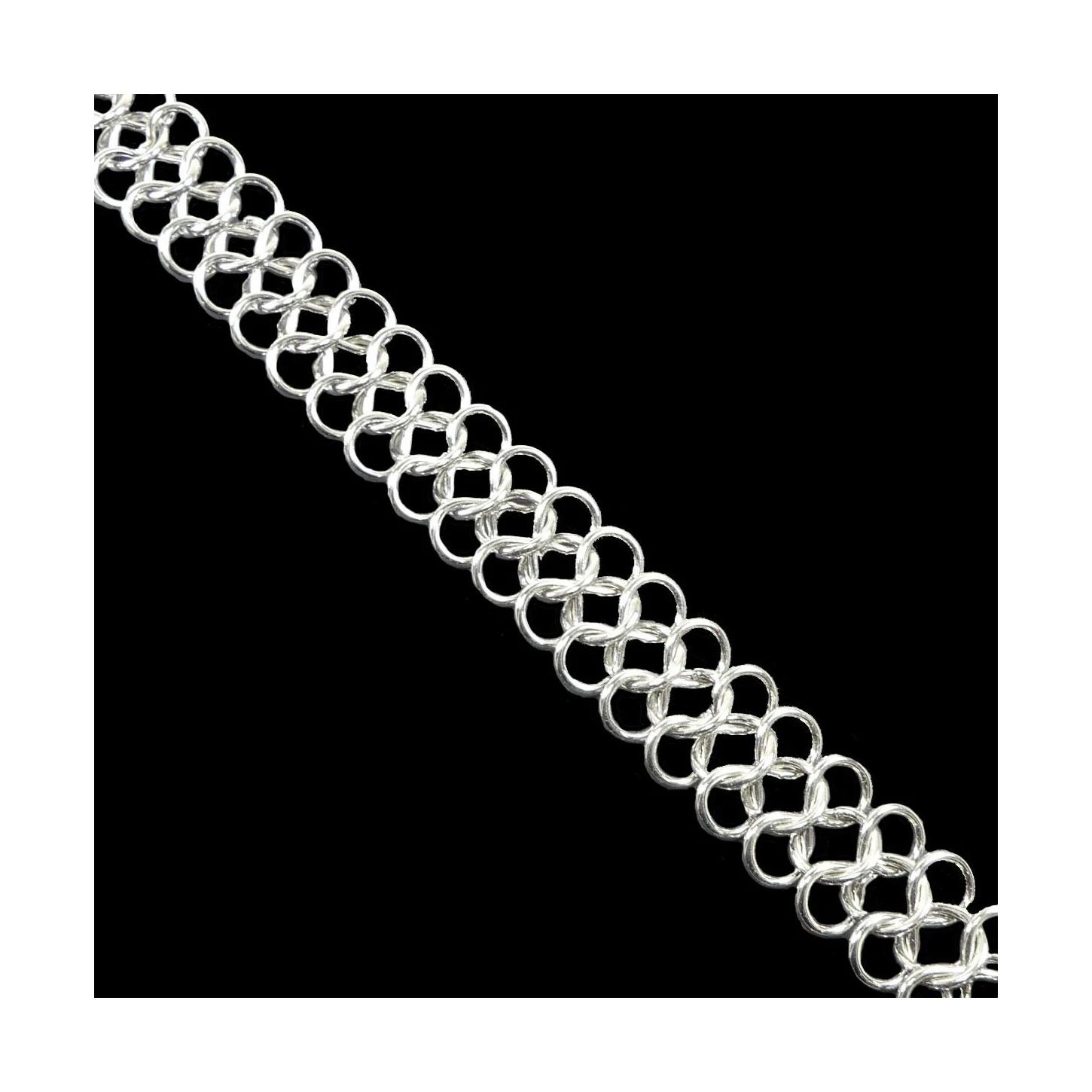 Original cadena metálica en color plateado y dorado con eslabones circulares que se enlazan unos con otros formando un entramado. El ancho total de la cadena es de 1,8cm y su peso es muy ligero y suave al tacto.
