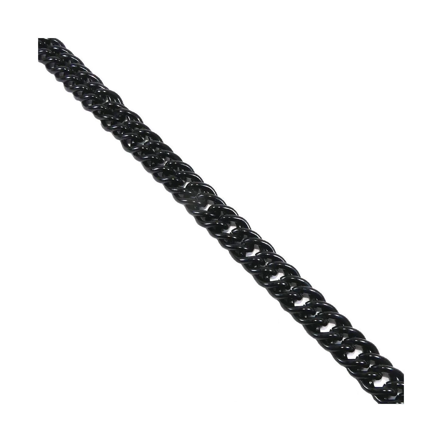 Cadena metálica en color plateado y negro con eslabones enlazados dobles y compuesta por aluminio lacado libre de níquel. El ancho total de la cadena es de 1,5cm y su peso es muy ligero y suave al tacto.