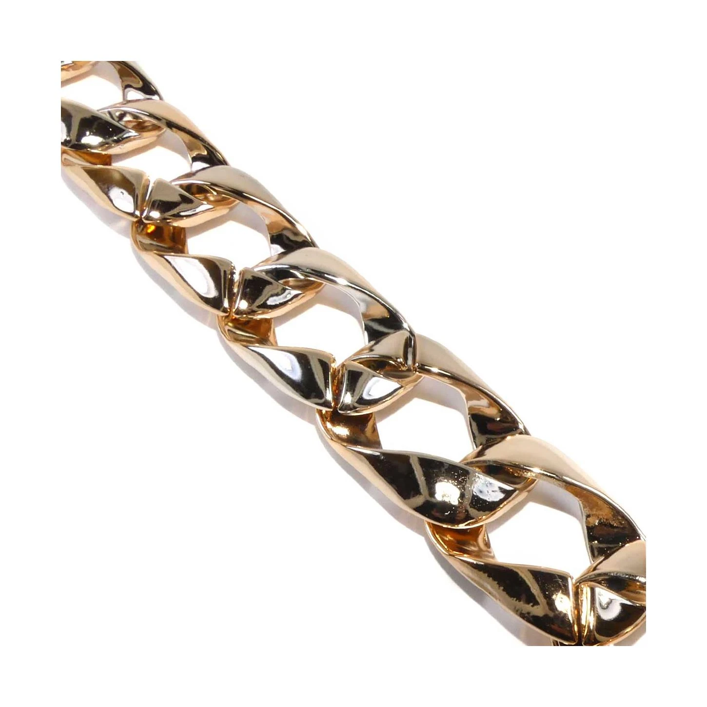 Cadena plástica en color metalizado brillo, con eslabones cuadrados y gruesos de 3,5cm de largo. El ancho total de la cadena es de 2,5cm y su peso es bastante ligero y suave al tacto.