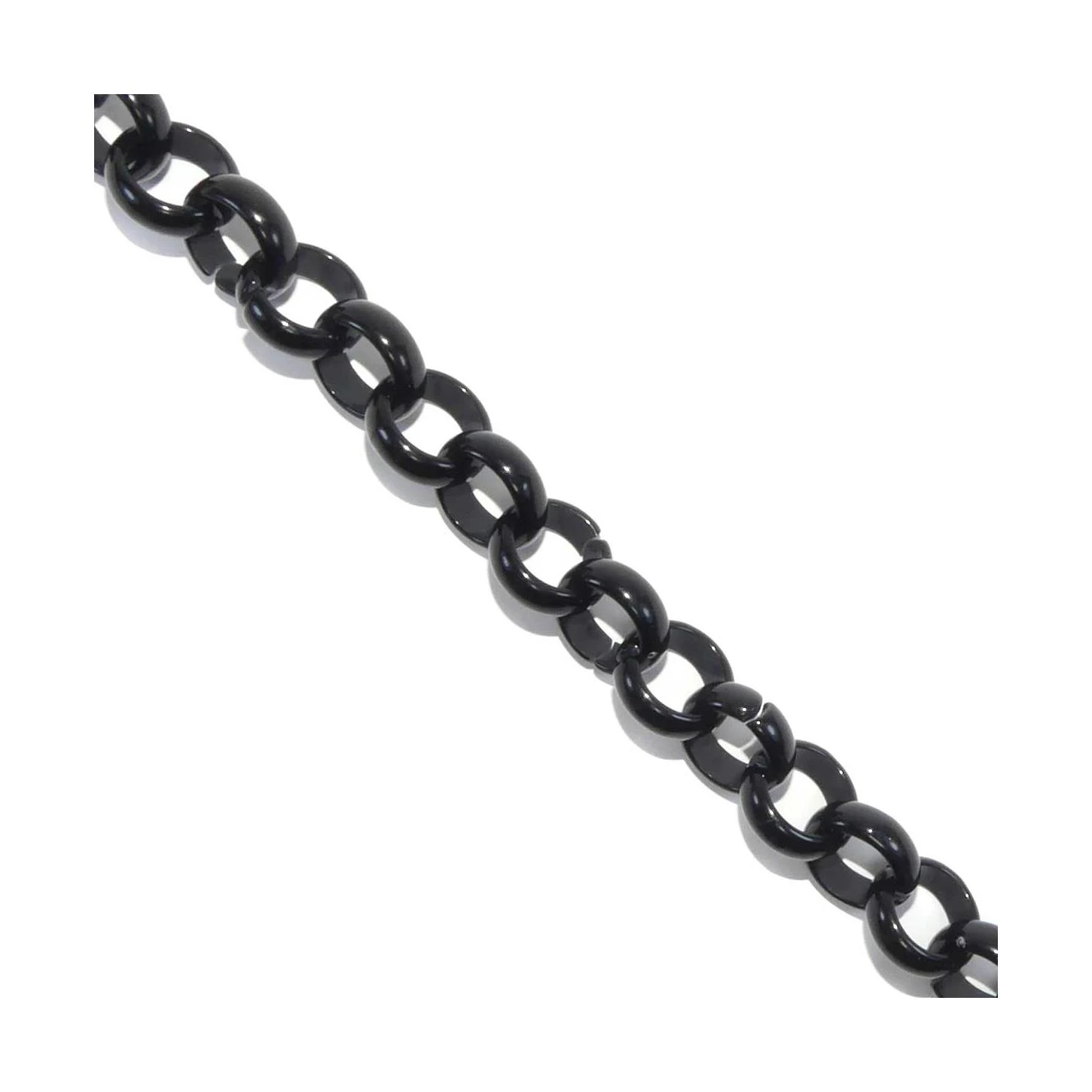 Cadena plástica de color negro, con eslabones circulares y gruesos de 1,8cm de diámetro. El ancho total de la cadena es de 2cm y su peso es bastante ligero y suave al tacto.