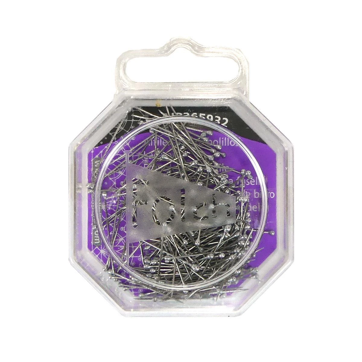 Caja de aproximádamente 200 alfileres de acero inoxidable con cabeza de pera. Con 26mm de longitud y 0,59mm de diámetro cada uno.