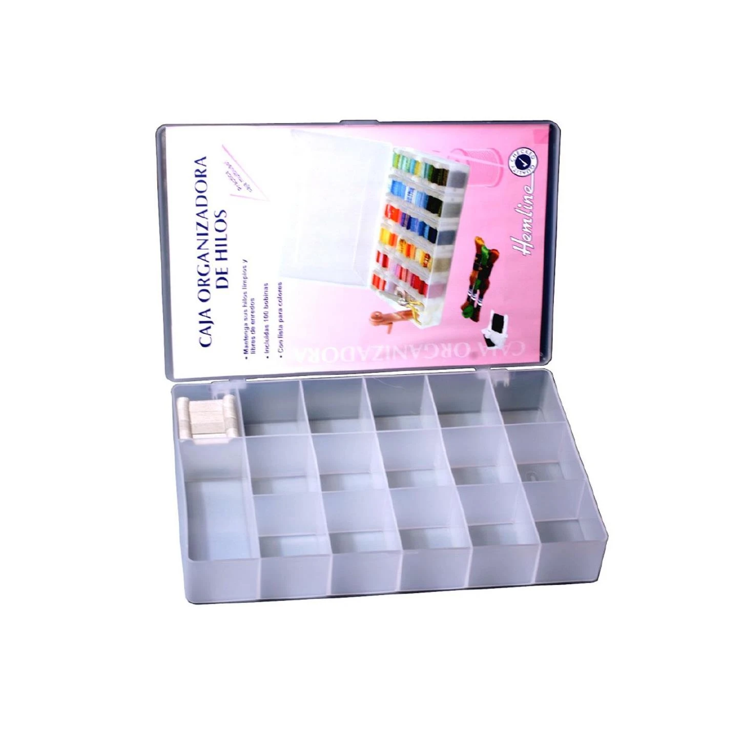 Resistente caja clasificadora de PVC semirrígido con separaciones interiores para organizar los hilos de bordar y con cierres de gran seguridad.