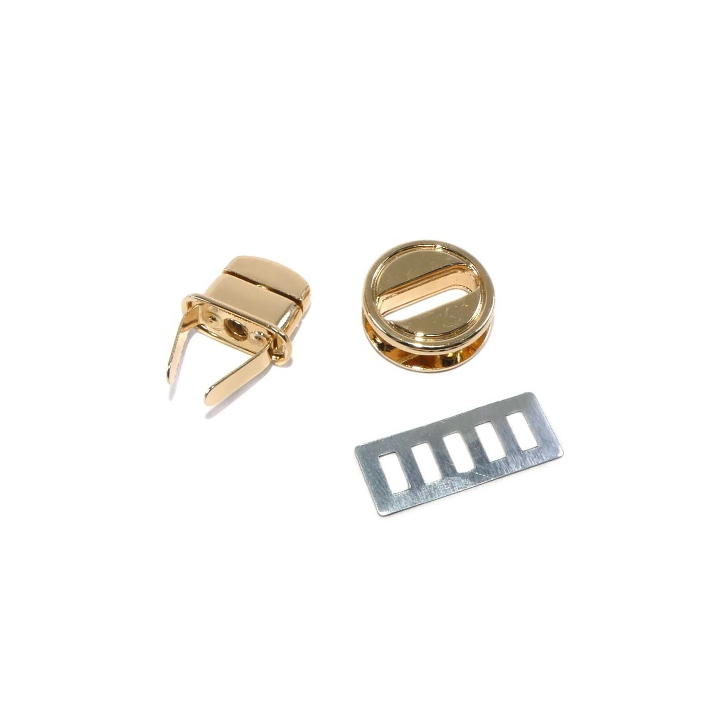 Original cierre para bolso con sistema de anclaje mediante tacha y pasador de seguridad giratorio.