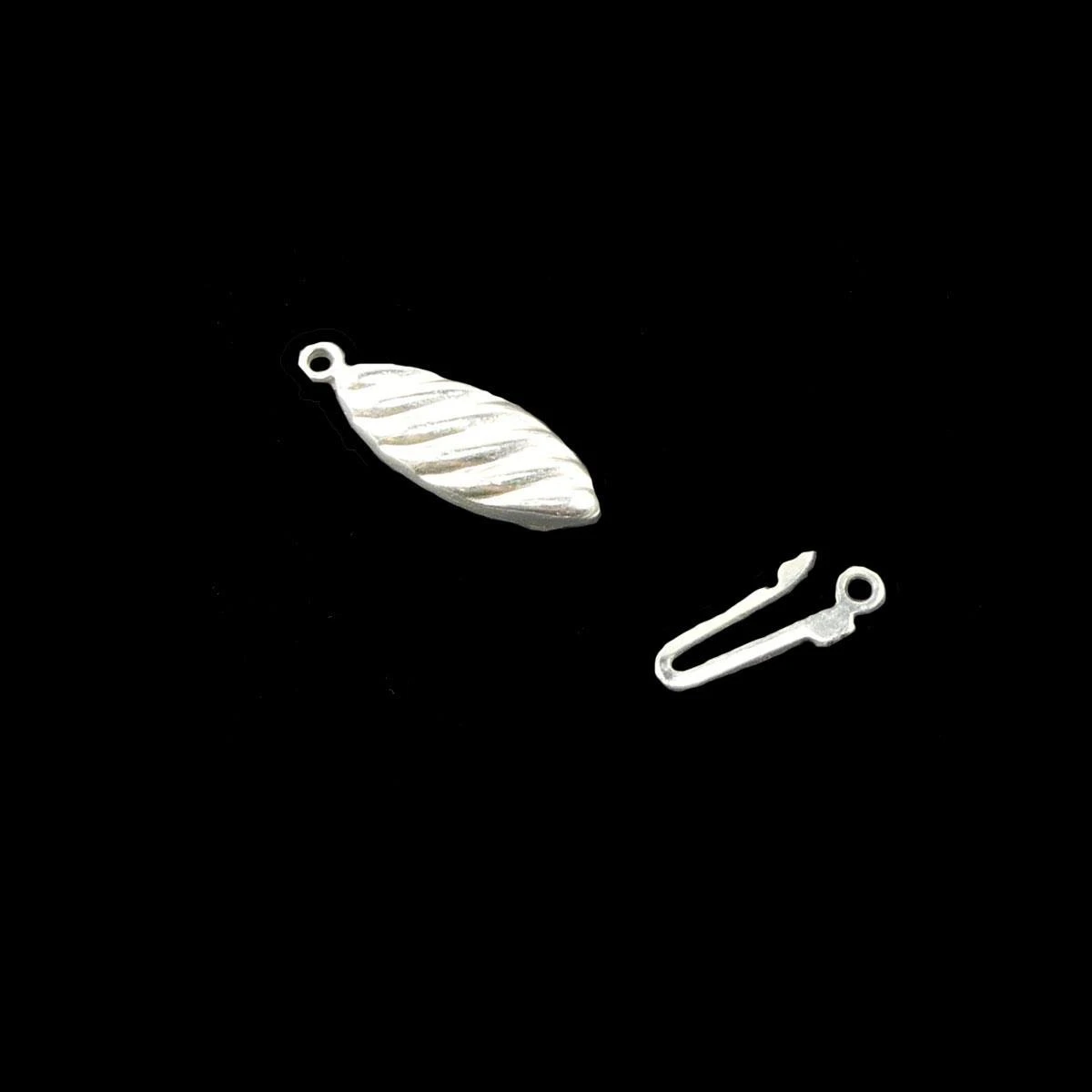 Broche completo metálico en color plateado, para hilo con una sola anilla en cada lateral, cuyo sistema consiste en introducción de una pieza en la otra y cierre por presión. Medidas 2cm de largo y 7mm de ancho.