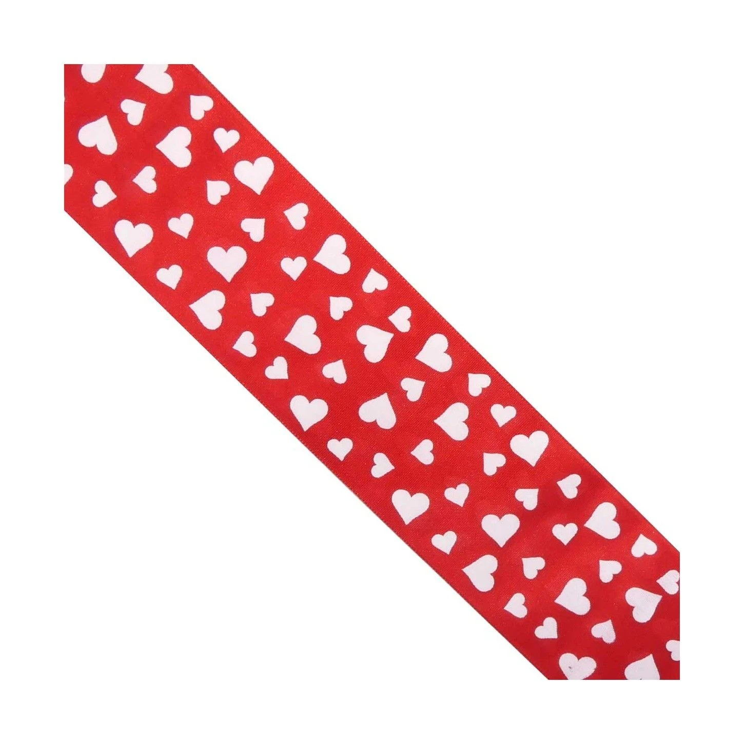 Cinta estampada de corazones, de faya (tafetán) con superficie rayada y a doble cara. Realizada con 100% poliéster y de 5cm de ancho.