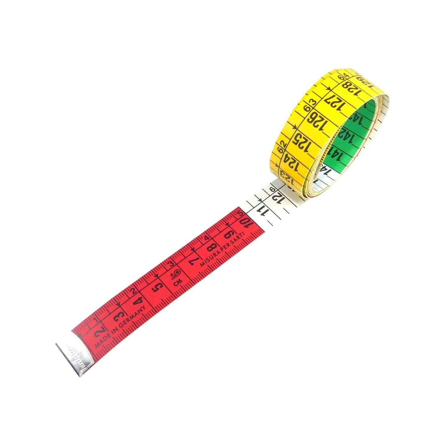 Cinta métrica clásica de sastre que alcanza los 1,5m de longitud. Color amarillo por un lado y blanco, rojo y verde por el otro. Con doble numeración en sus caras, ambas en centímetros.