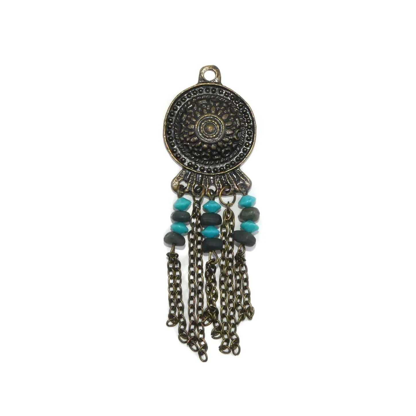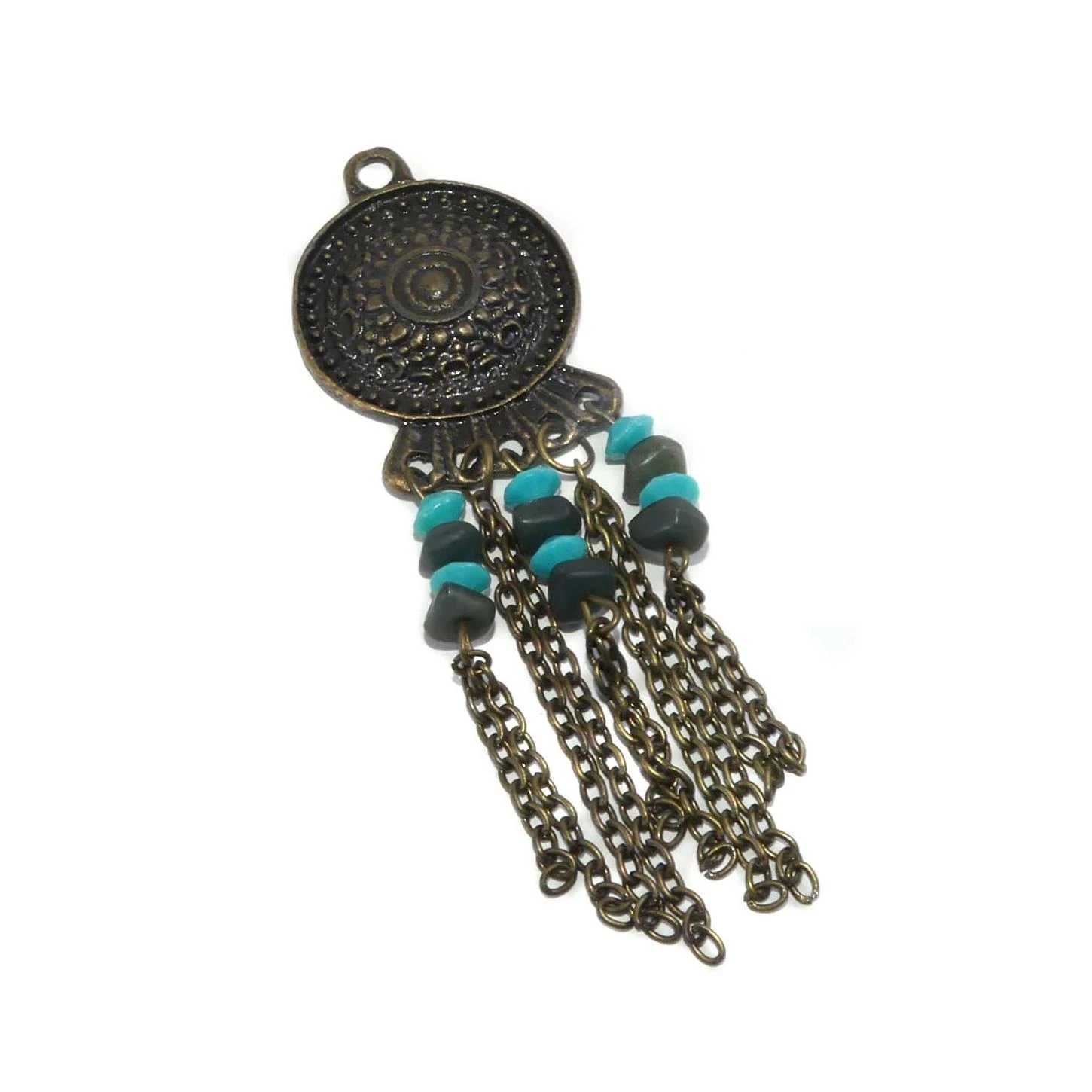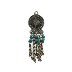 Colgante con forma de círculo labrado con cadena y abalorios en turquesa colgando del mismo. En oro viejo y perfecto para realizar pendientes, collares, etc.