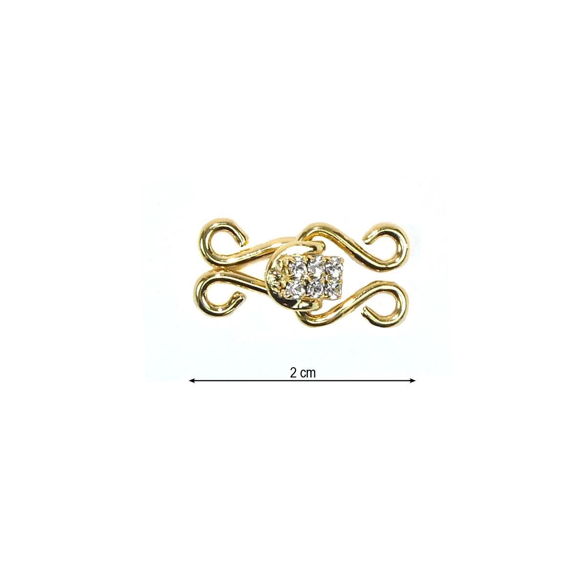 Broche o cierre de fantasía para chaqueta, camisa o abrigo, metalizado en dorado con cristales blancos engarzados. Tiene una longitud total una vez unidas las piezas de 2cm.