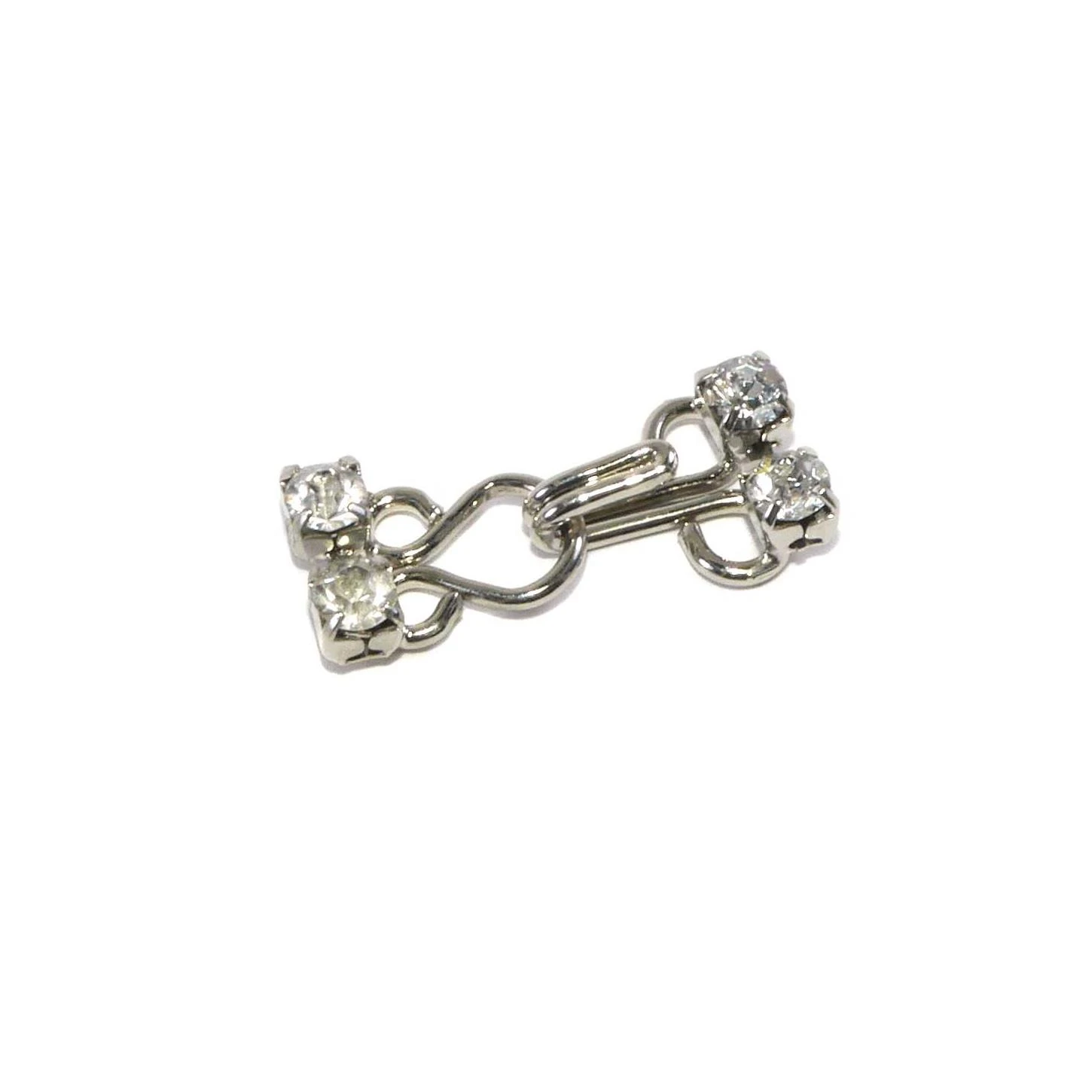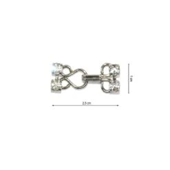 Broche o cierre de fantasía para chaqueta, camisa o abrigo, metalizado en plata con cristal engarzado. Se cose cada parte del broche como un corchete y tiene una longitud total una vez unidas las piezas de 2,5cm.