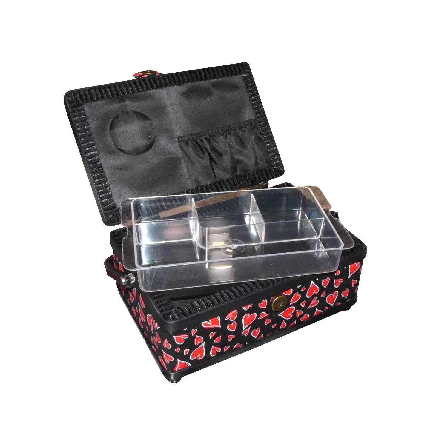 Incorpora asa para poder transportar fácilmente y en su interior encontraremos un gran espacio y una bandeja plástica para colocar los pequeños objetos de costura. En el interior de la tapa viene incorporado un pequeño alfiletero y un bolsillo.