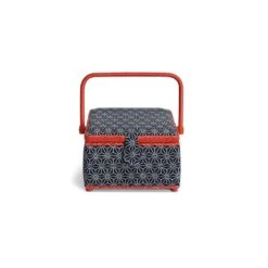 Costurero en rojo y azul marino, con estampado geométrico. Las medidas del mismo son: 23cm de largo, 23cm de ancho y 14cm de alto.