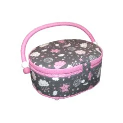 Costurero original ovalado con asa de mimbre y estampado de nubes, lunas y estrellas en rosa y blanco sobre fondo gris. De 23cm de largo, 17cm de ancho y 11cm de alto.