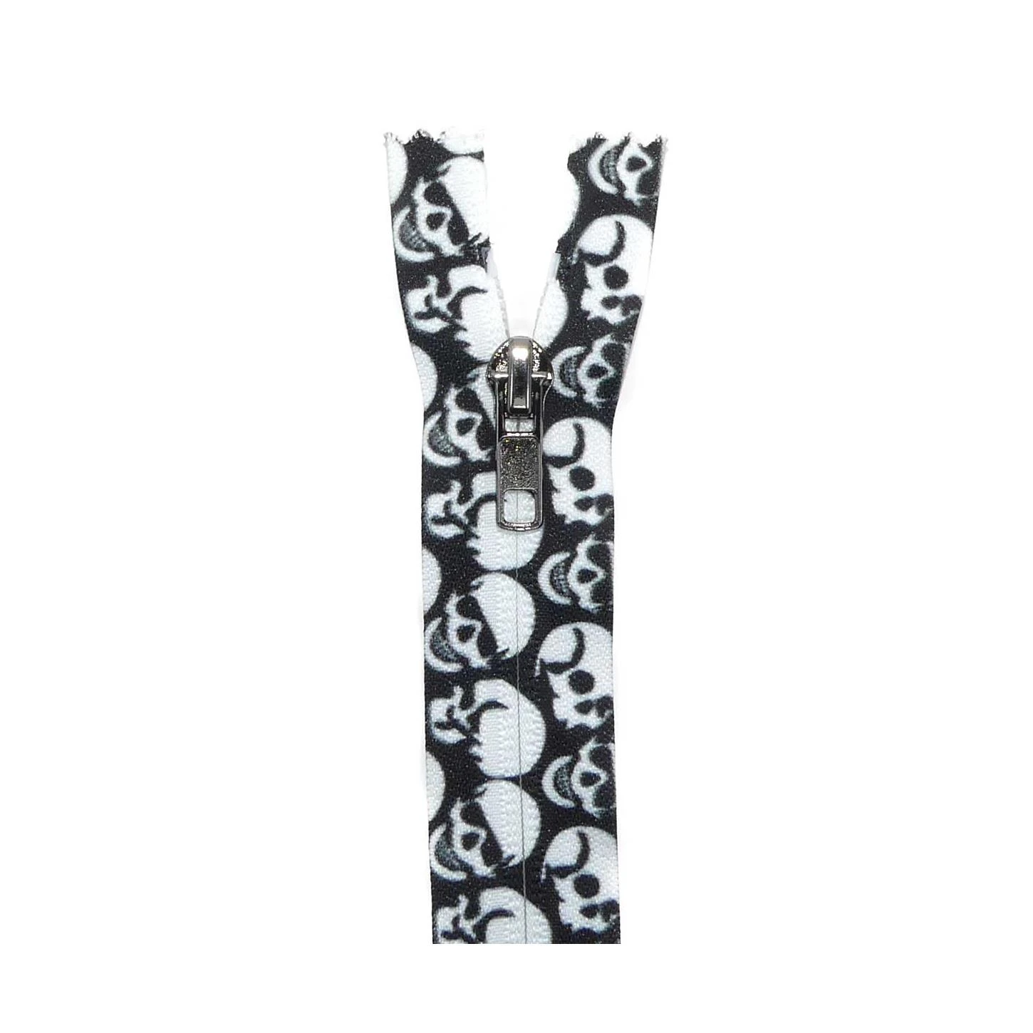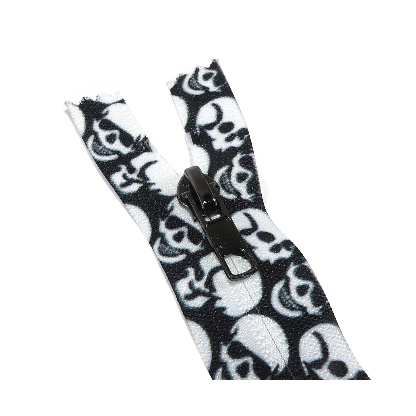 Cremallera invisible con cursor del tamaño 5 y estampado de calaveras en blanco y negro. La longitud de la misma es de 18cm.