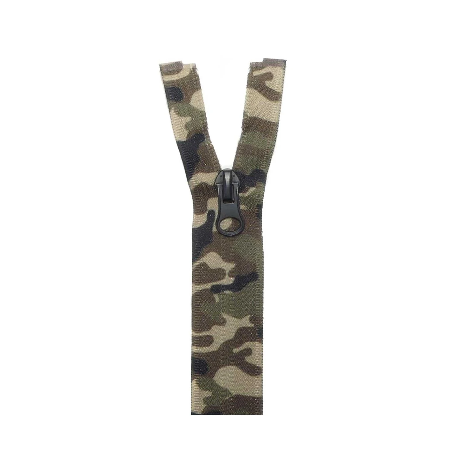 Cremallera invisible, de nylón con separador y estampado de camuflaje en tonos verdes y marrones. Con diente del tamaño 6 y disponible en varias longitudes. Seleccionar el tamaño deseado a continuación.