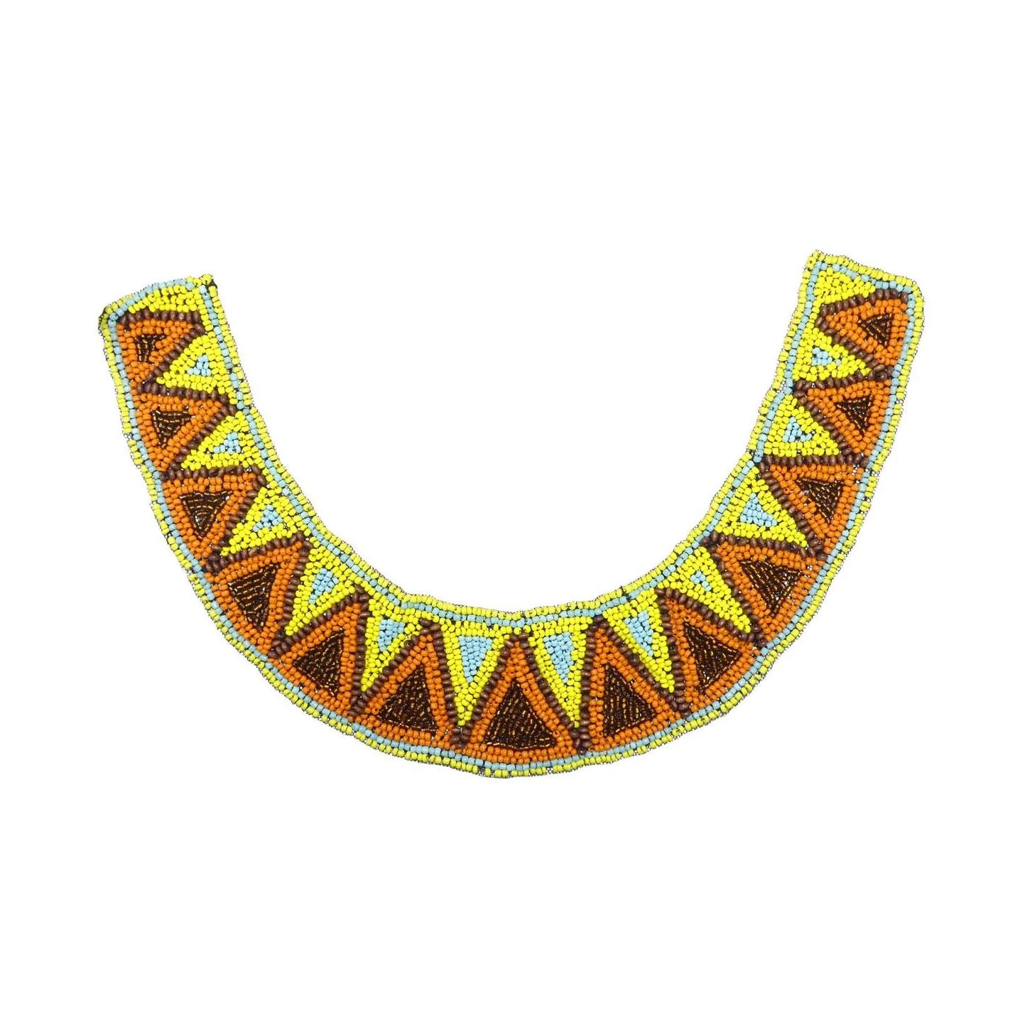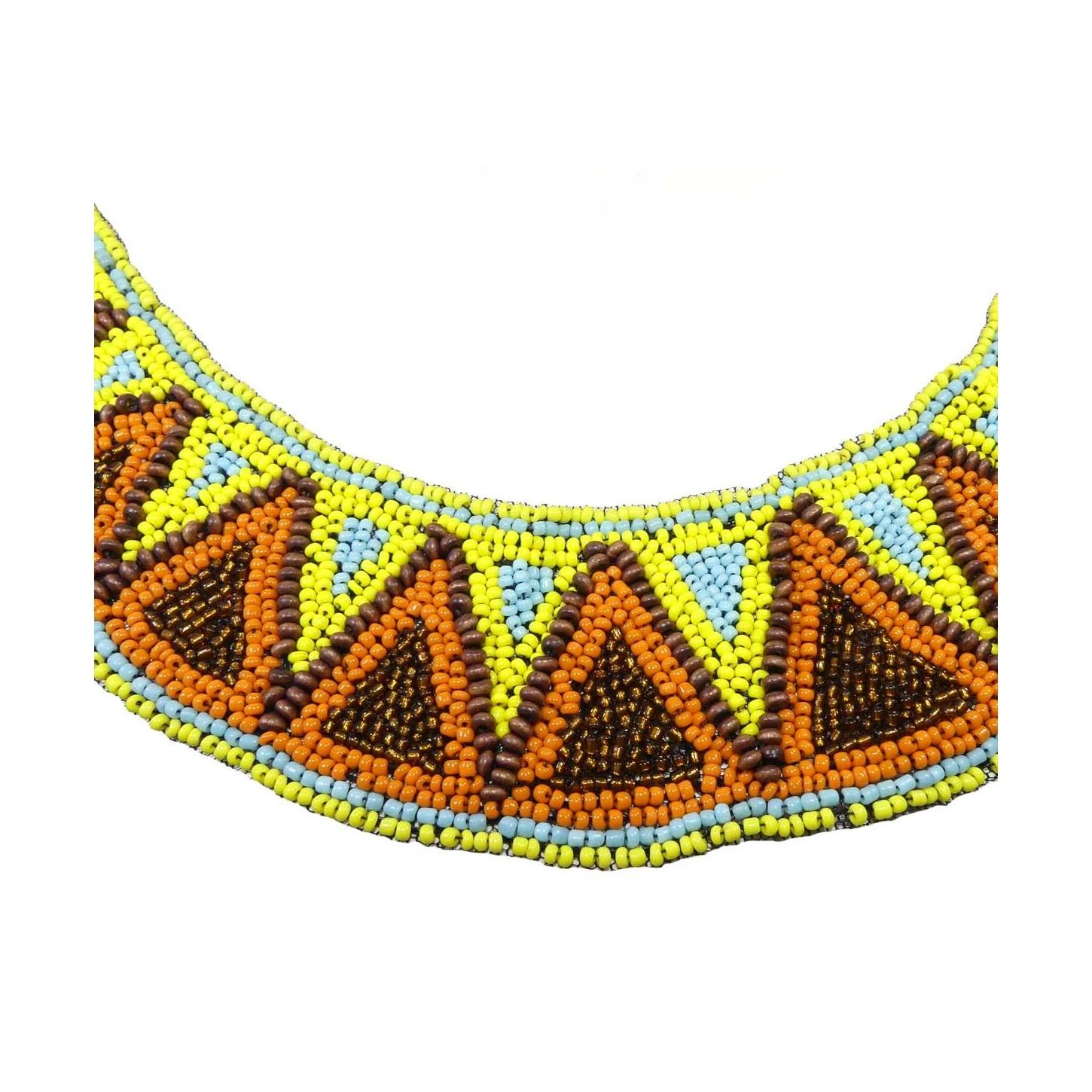 Original cuello realizado en rocalla de diferentes colores cosida sobre una base de tul negra, conformando un diseño étnico. De dimensiones 27cm de longitud y hasta 17cm de alto.