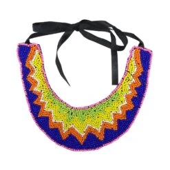 Original cuello realizado en rocalla de diferentes colores cosida sobre una base de tul negra, conformando un diseño étnico. De dimensiones 27cm de longitud y hasta 17cm de alto. Con una cinta de raso para el atado al cuello.