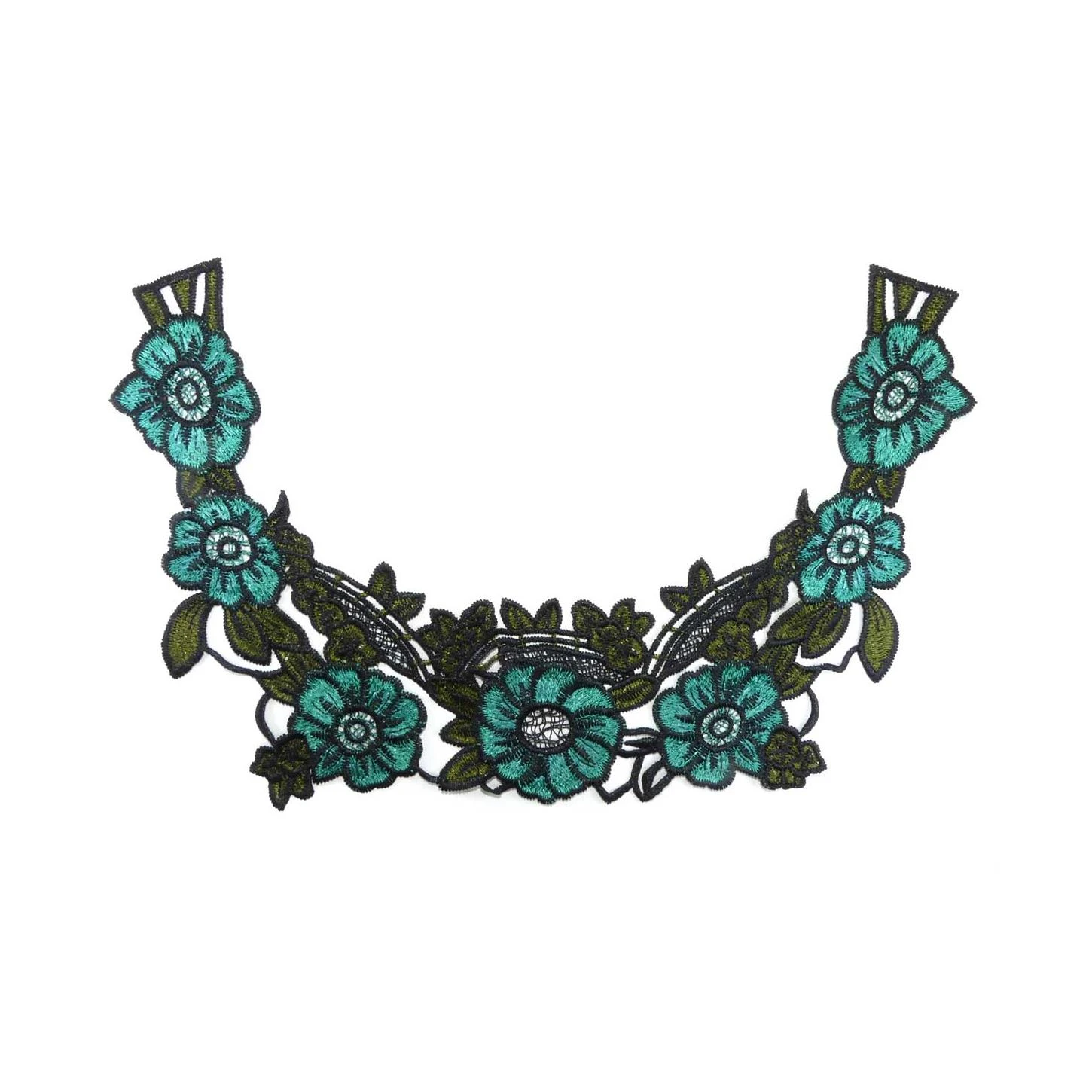 Elegante cuello bordado de guipur con estilo floral en color verde y caqui y de tamaño 30cm de ancho y 19cm de alto.