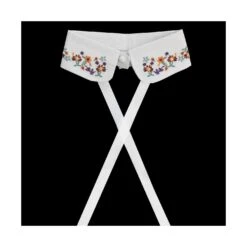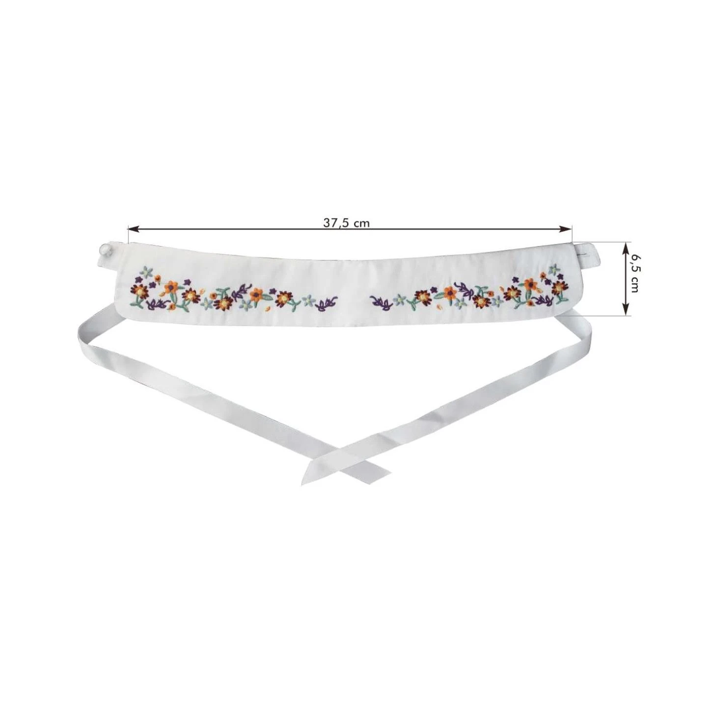 De dimensiones 37,5cm de longitud y hasta 6,5cm de alto, y con una cinta de raso con función de lazo para el atado al cuello.