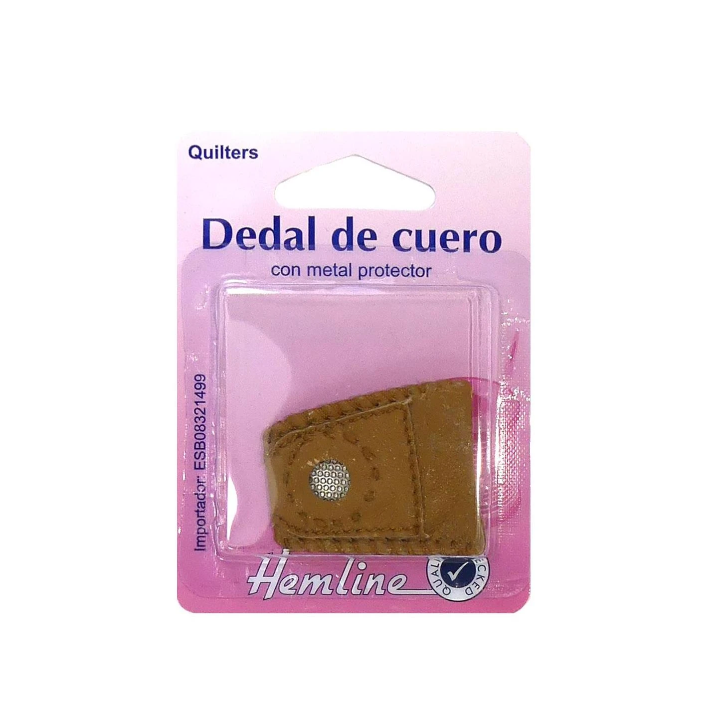 Dedal realizado en cuero con placa de metal encajada en la parte central de la punta del dedo como refuerzo. De un diámetro máximo de 2,5cm.