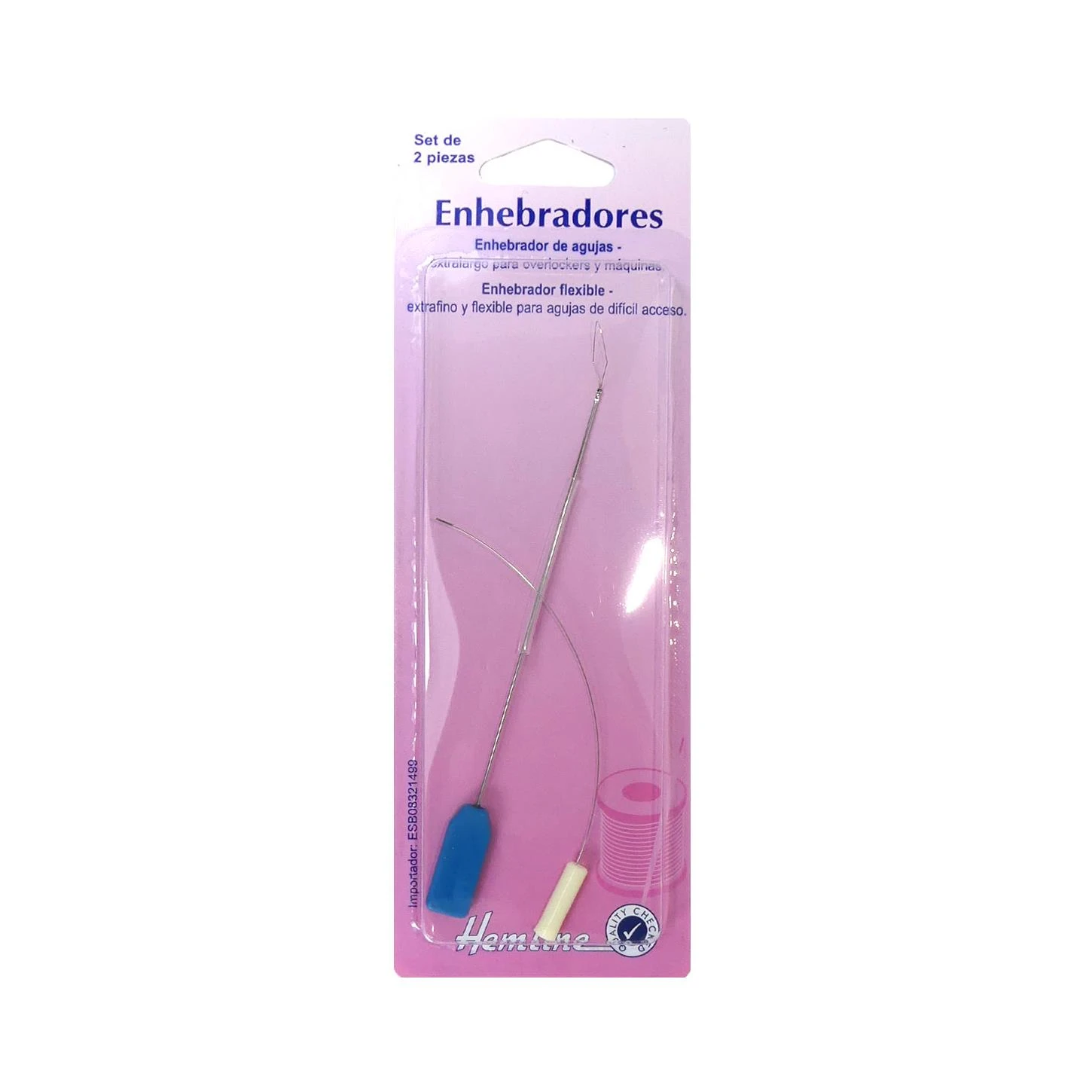 Dos enhebradores de aguja, uno extralargo para overlockers y máquinas, y uno flexible extrafino para agujas de difícil acceso.