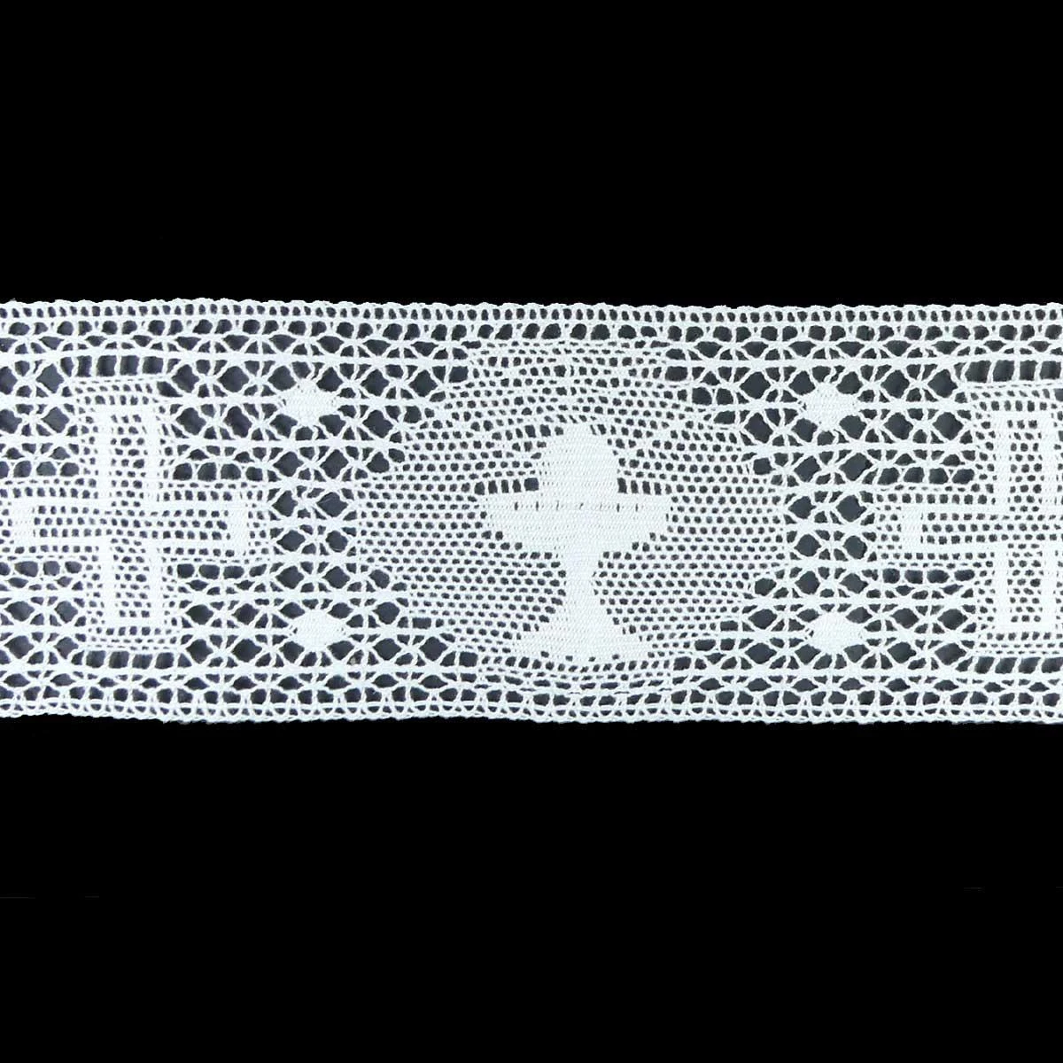 Entredós de bolillo en blanco y diseño religioso con cruz cristiana y cáliz. Posee el cuerpo característico del bolillo, lo que le confiere un aspecto clásico. De ancho total 6cm.