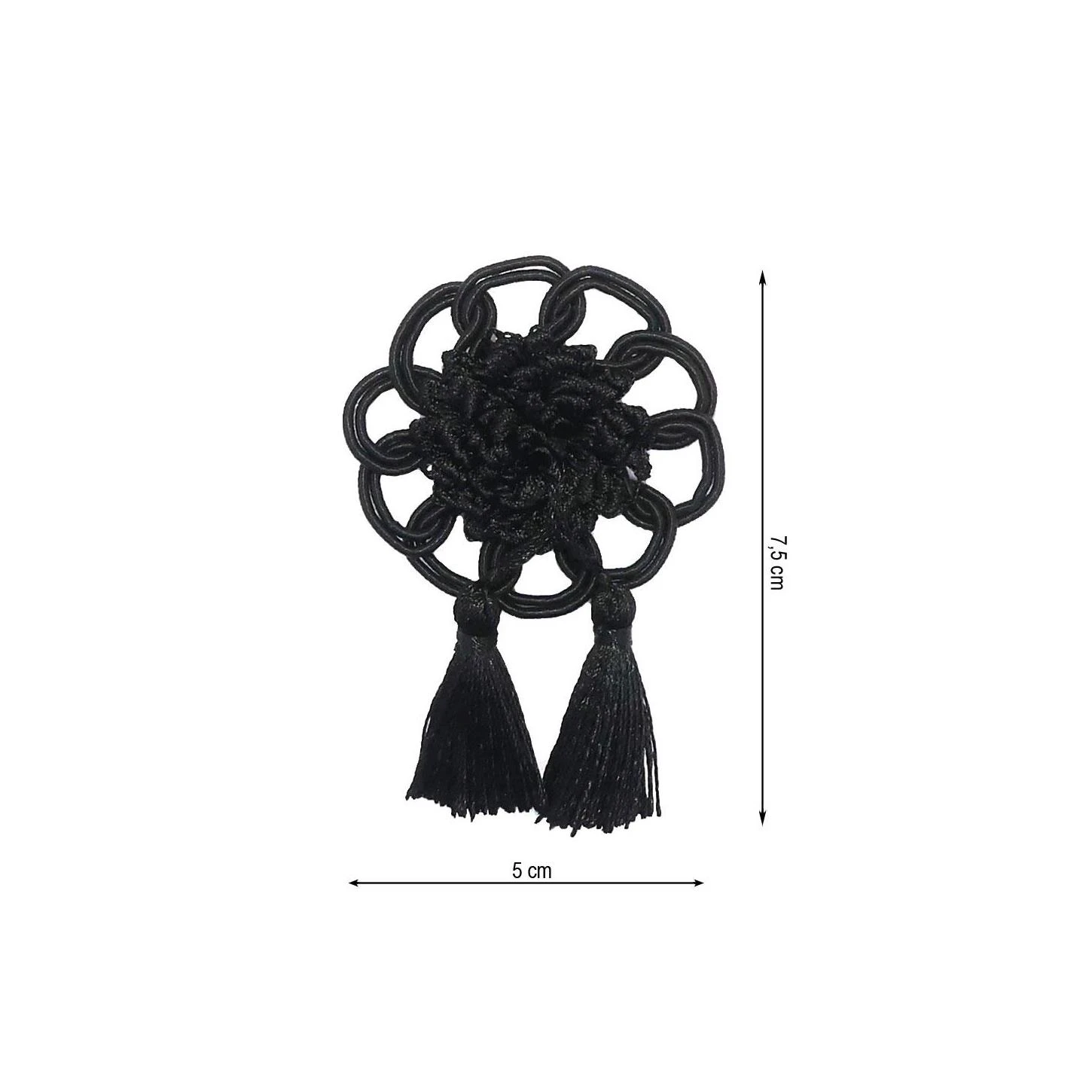 Aplicación de pasamanería negra de 7,5cm de largo y 5cm de ancho en forma de rosetón y dos borlas decorativas.