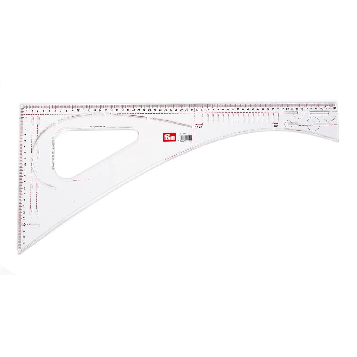 Regla o escuadra de diseño transparente de material plástico duro, con 60cm de largo y 24cm de ancho, con plantillas y medidas de modelaje en su interior.