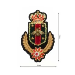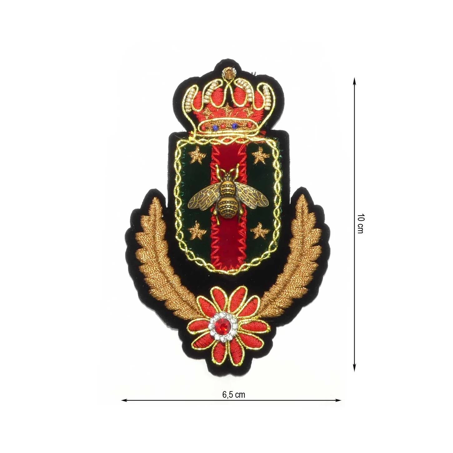 Aplicación termoadhesiva en forma de escudo con bordado en varios colores y figura metalizada de abeja con rocalla y strass incorporados en el diseño. De 6,5cm de ancho y 10cm de alto.