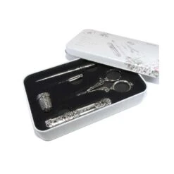 Precioso conjunto de elementos para el bordado con grabado estilo rococó en un estuche de metal decorativo.