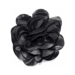 Aplicación con forma de flor cuyos pétalos son de tela de satén o raso, conformando un diseño circular de 18cm de diámetro y 5cm de altura.