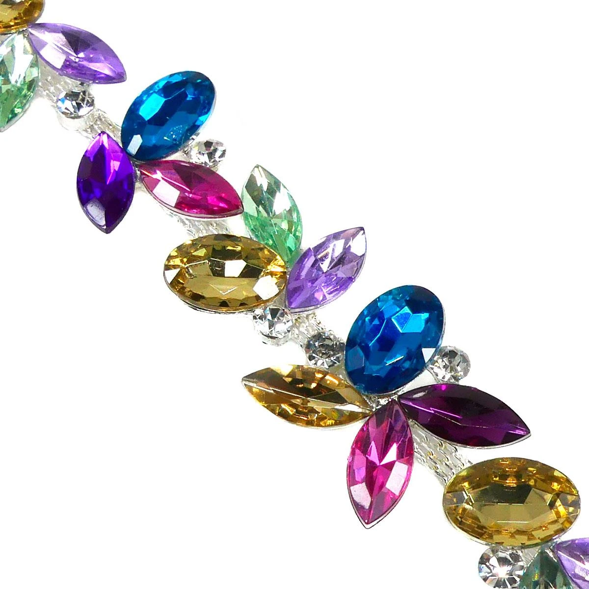 Precioso galón con cristales multicolor que quedará ideal para decorar prendas como camisetas, vestidos, bolsos y accesorios, dando un toque de brillo y elegancia muy especial.