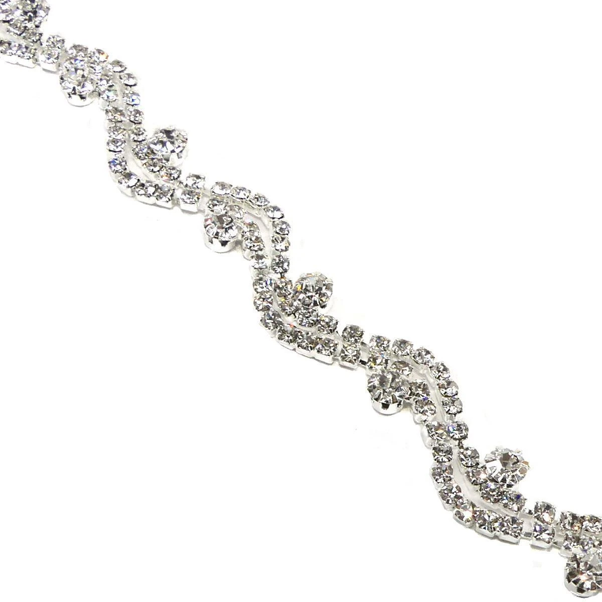Tira o pasamanería de strass para coser con base metálica en plata y strass blanco, conformando un diseño de ondulina doble con 8mm de ancho total.