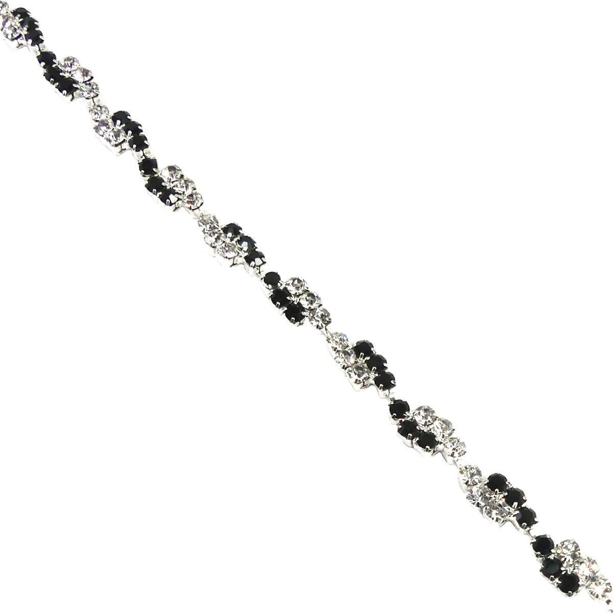 Tira o pasamanería de strass para coser con base metálica en plata y strass blanco, conformando un diseño de ondulina con 5mm de ancho total. Disponible en blanco y negro.