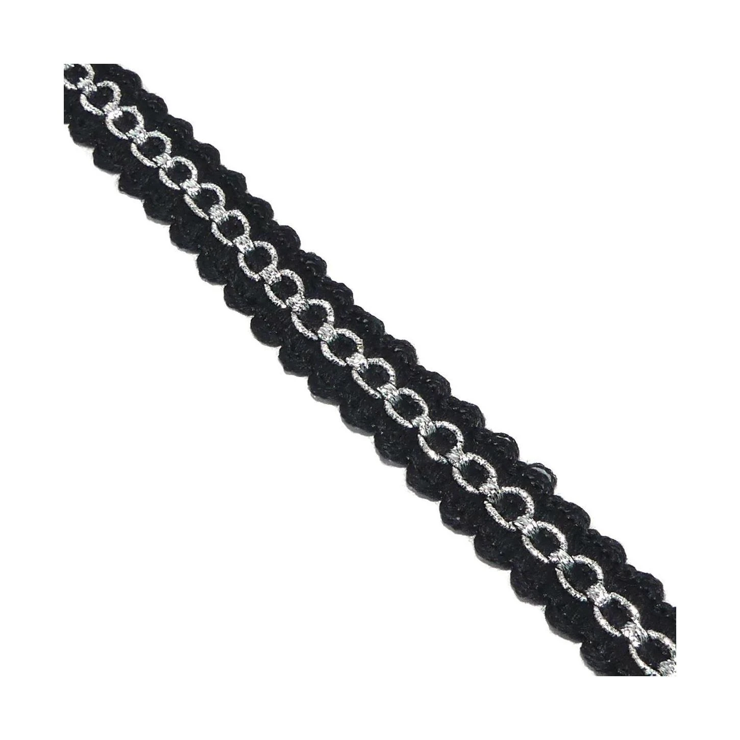Este galón podrá decorar de modo sofisticado cualquier prenda, sobre todo en aquellas negras, otorgándole un punto de brillo gracias al bordado metalizado de su interior.