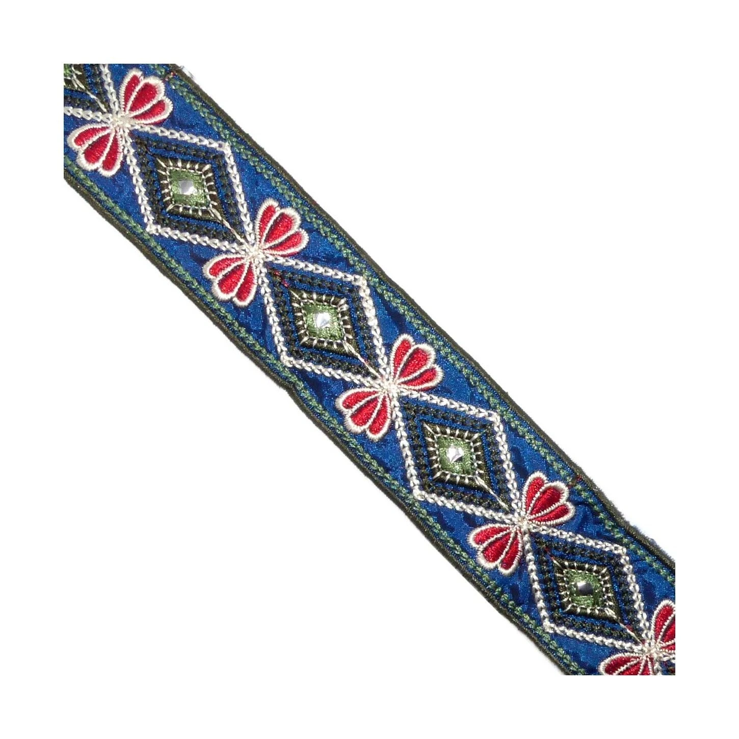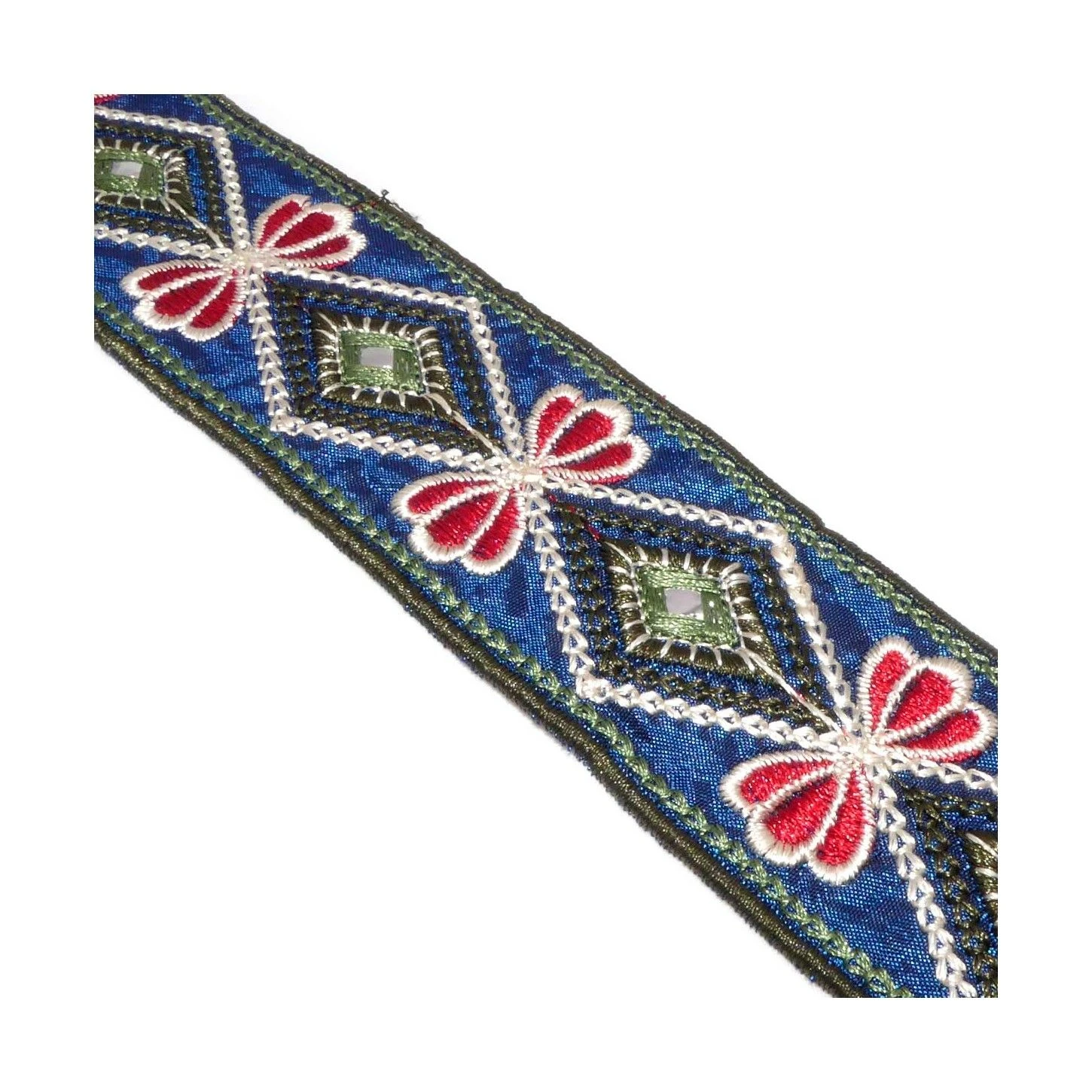 Cinta tapacosturas o galón bordado y estampado con motivos geométricos y florales complementados con pequeñas piezas que hacen las veces de espejo. La cinta tiene un ancho total de 4,5cm.