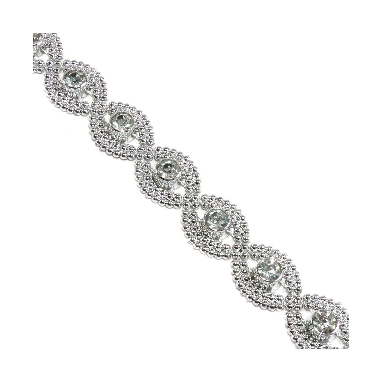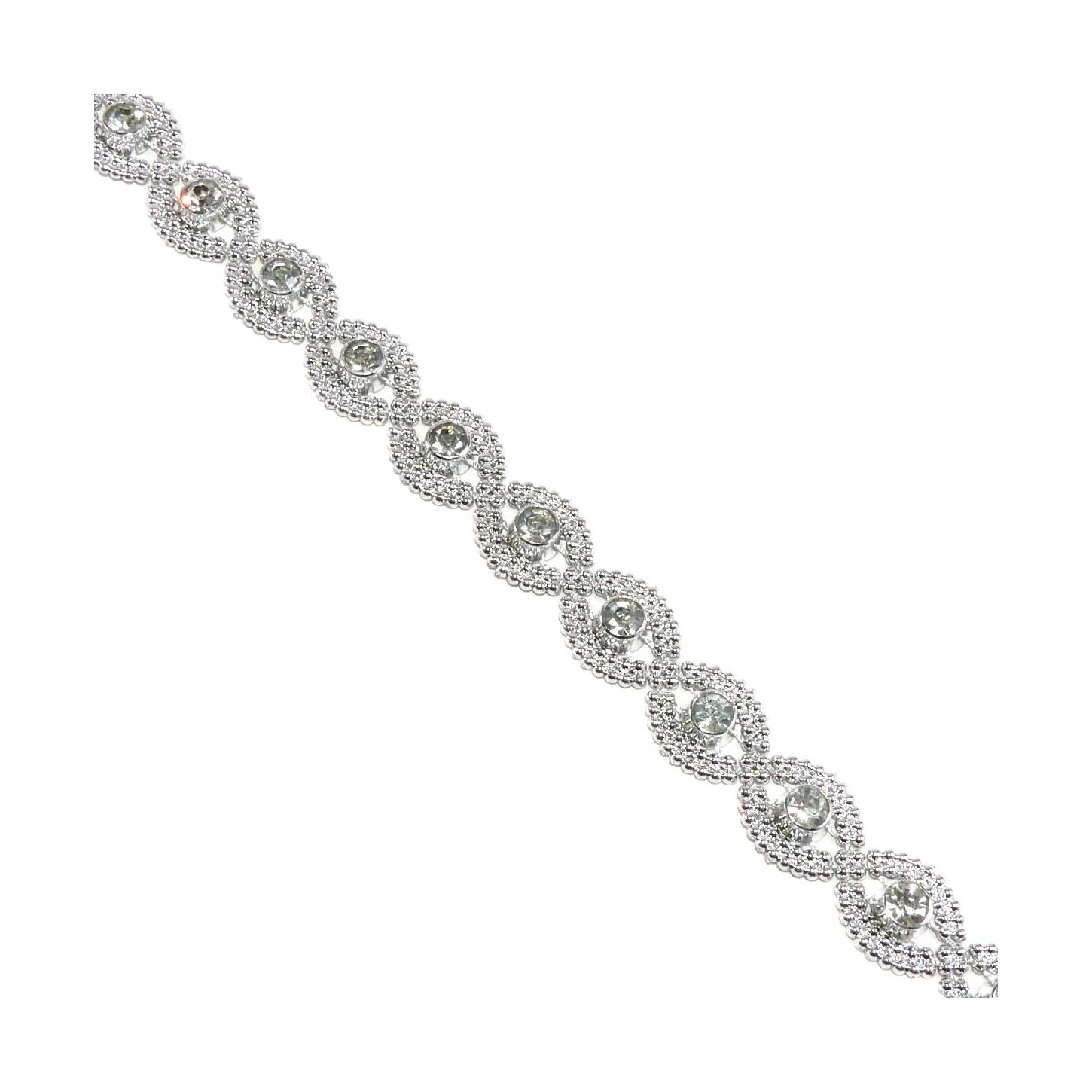 Galón o pasamanería con forma de cadena plateada de imimetal y diseño de óvalos con imicristal blanco conformando un ancho de 12mm.