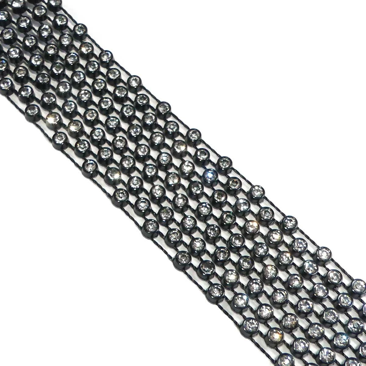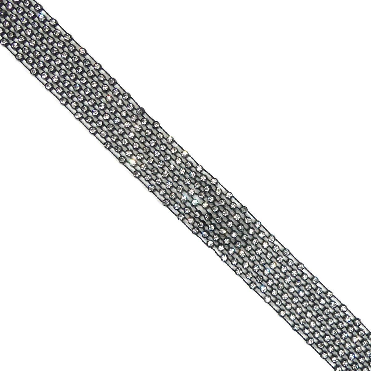 Pasamanería de strass distribuido en seis filas dispuesta para coser. Base plástica en negro y cristal blanco. Ancho 20mm.
