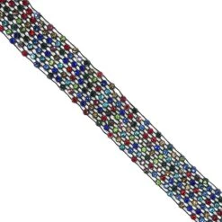 Pasamanería de strass distribuido en seis filas dispuesta para coser. Base plástica en negro y cristal multicolor. Ancho 25mm.