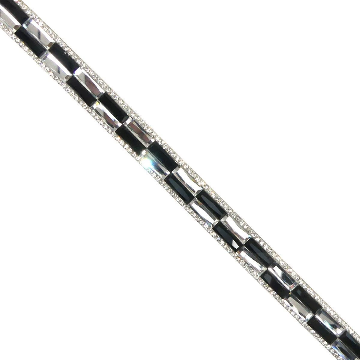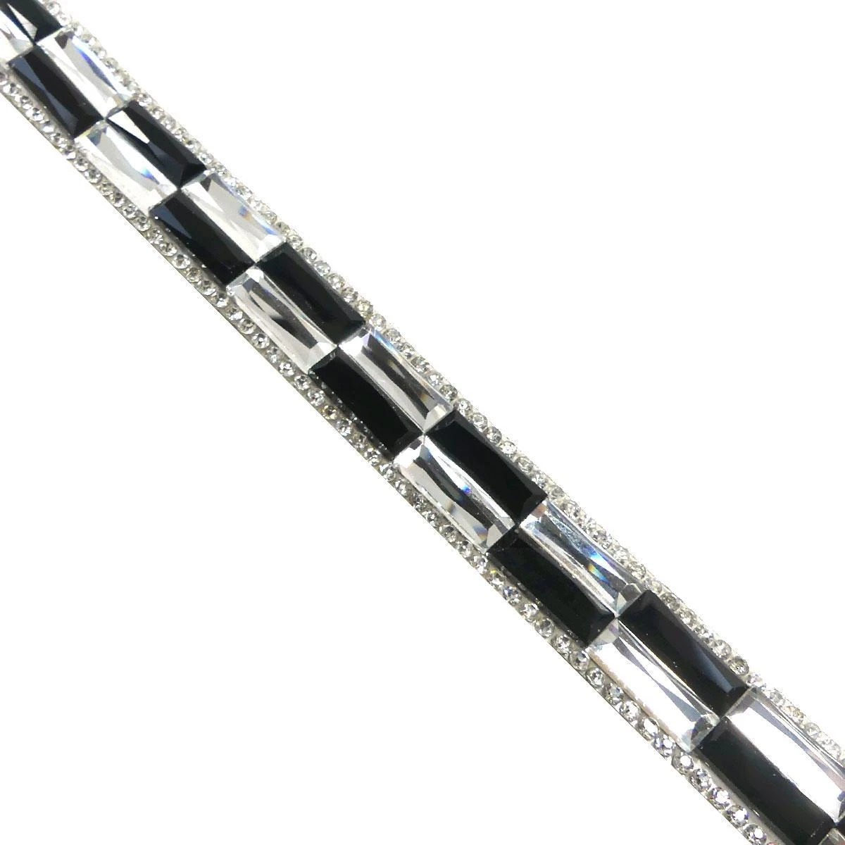 Tira o pasamanería de strass termoadhesiva (para pegar con plancha) con cristal blanco y negro de forma rectangular y pequeñas piezas de strass, conformando un ancho de 1,5cm y de una longitud total de 39cm.