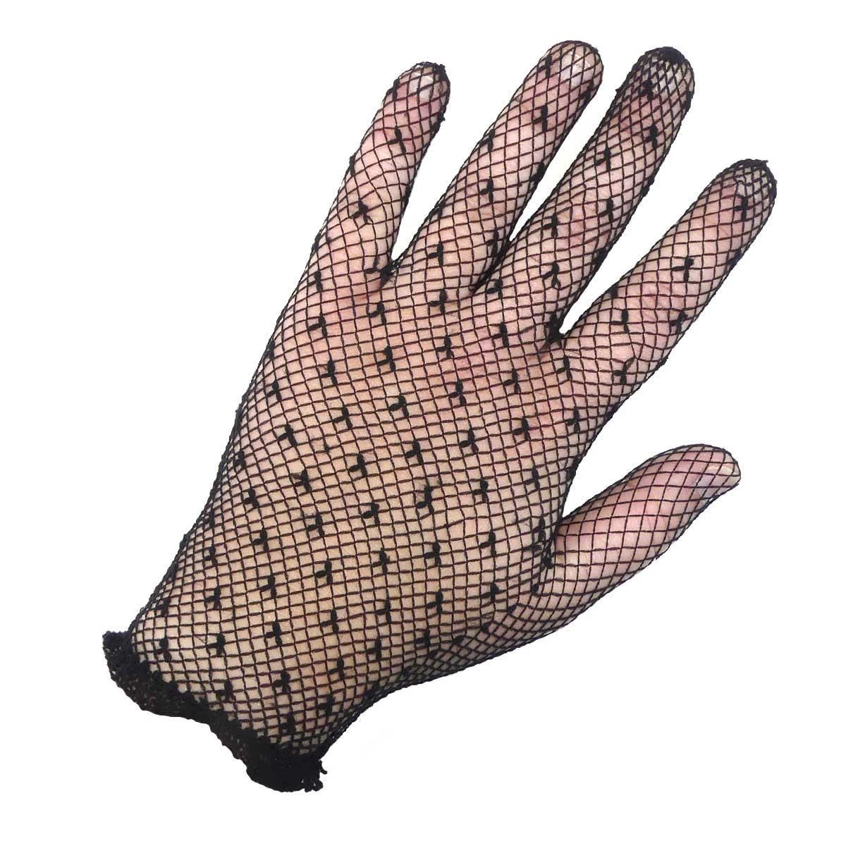 Pareja de guantes cortos en color negro y calados con dibujo de flores distribuidas en todo el dorso del guante. Muy adaptables, ceden con facilidad y para manos de hasta 17cm de longitud y 8,5cm de ancho.