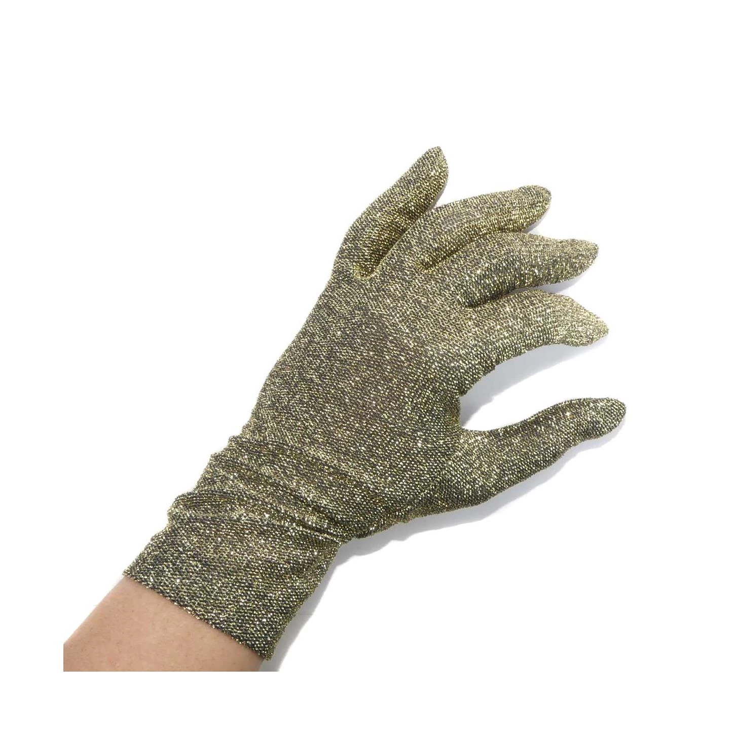 Par de guantes cortos de lamé en oro para adulto muy adaptables a la mano de 25cm de largo y 9,5cm de ancho.