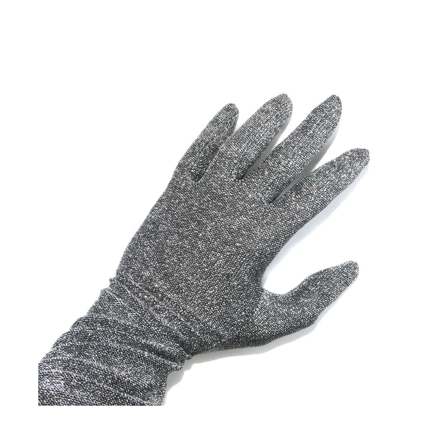 Par de guantes largos de lamé en plata para adulto muy adaptables a la mano de 45cm de largo y 9,5cm de ancho.
