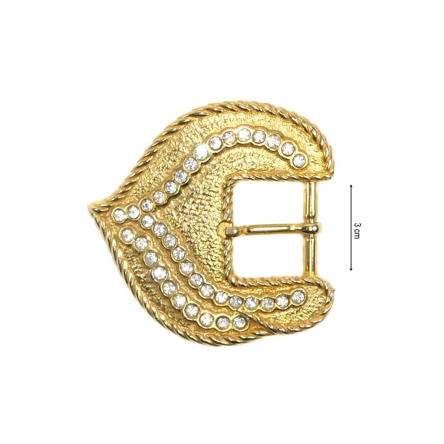 Preciosa hebilla metálica para cinturón de color oro con strass incorporado en el diseño Con forma ovalada en pico y un paso de cinta de 3cm.