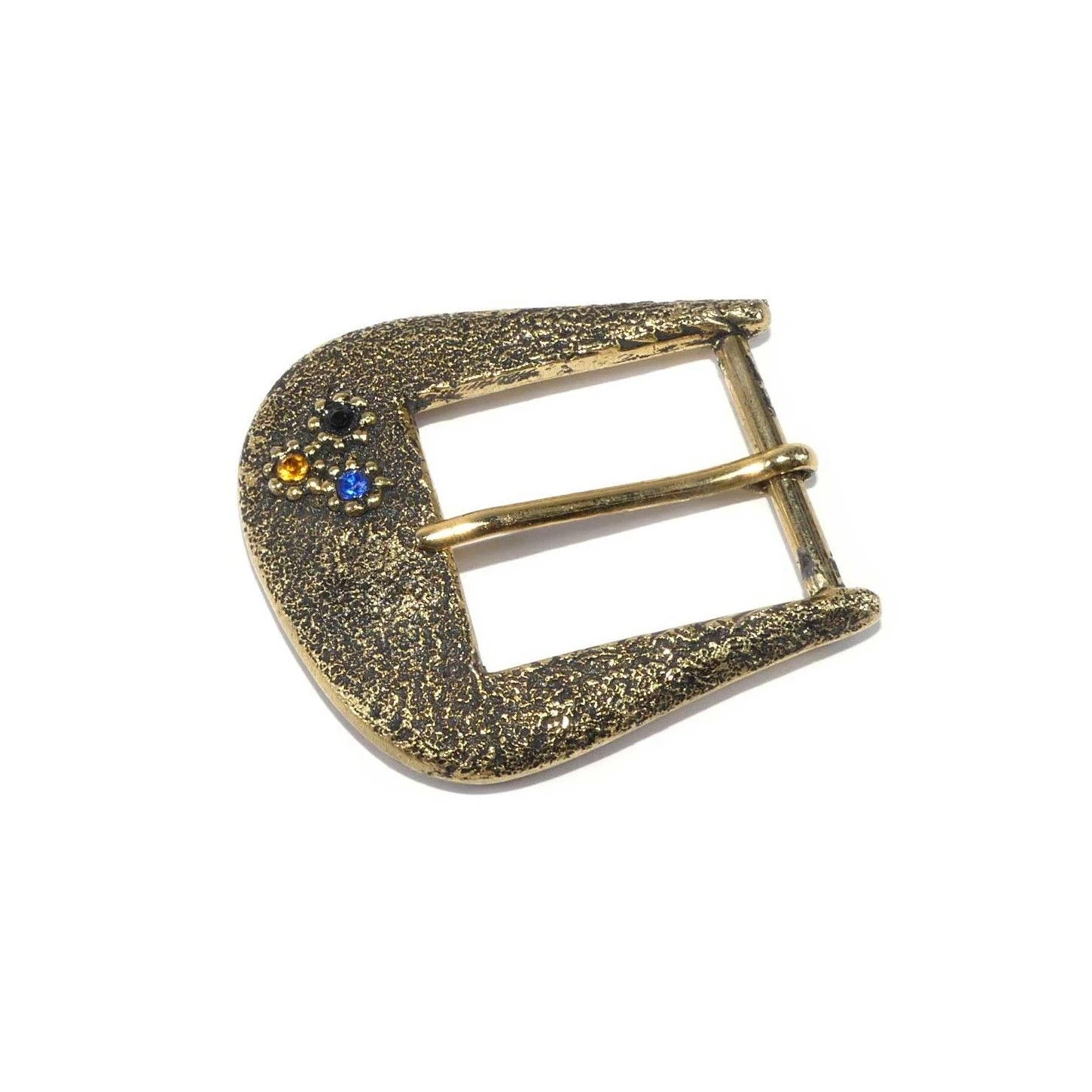 Es una hebilla metálica con superficie irregular que destaca por sus pequeñas flores decorativas realizadas con cristales de colores.
