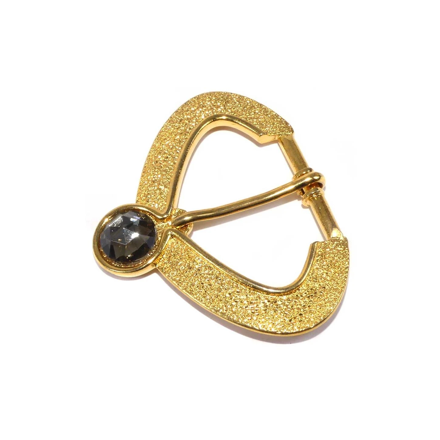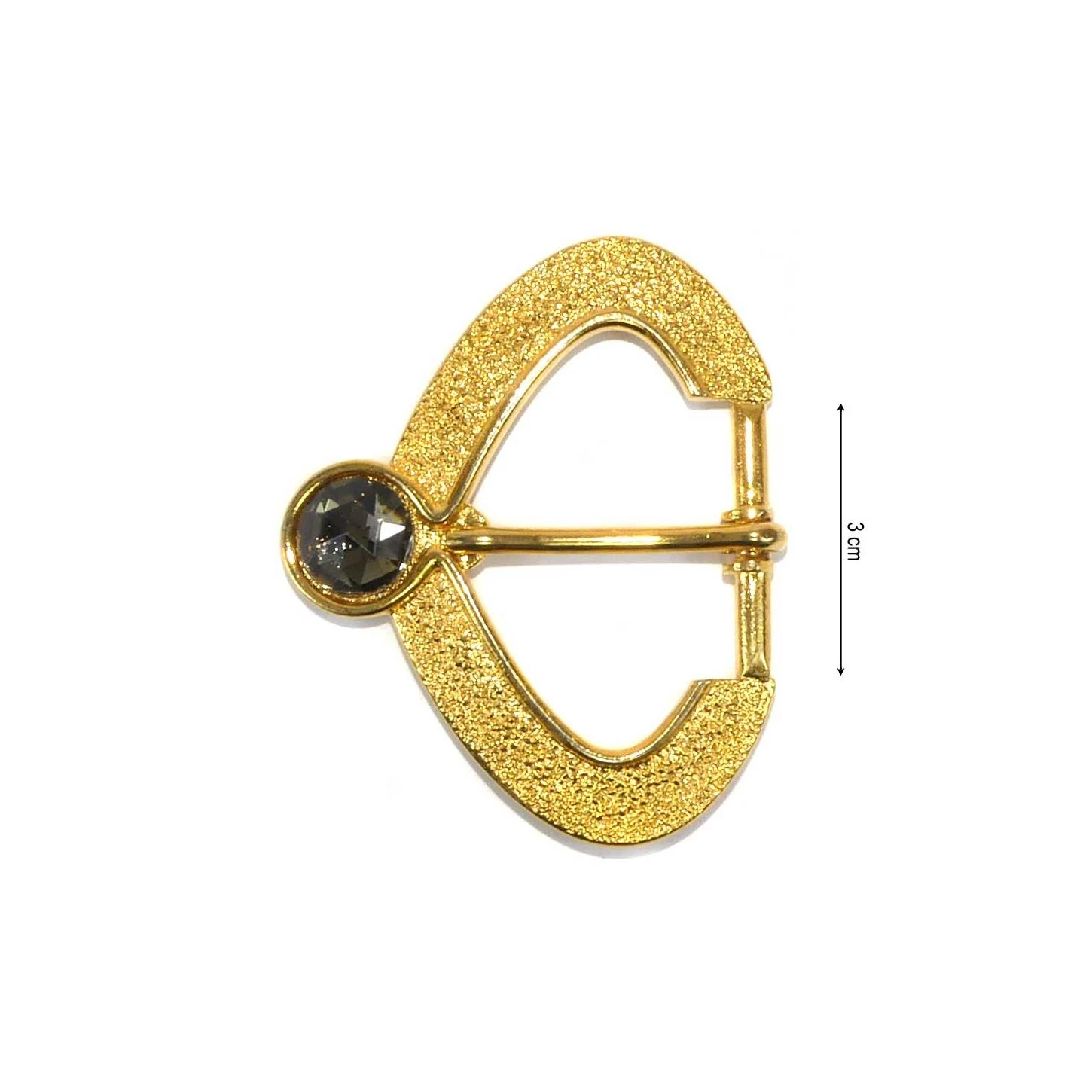 Hebilla dorada original con forma picuda y 3cm de paso para la cinta. Labrada en su interior y con piedra de cristal decorativo.